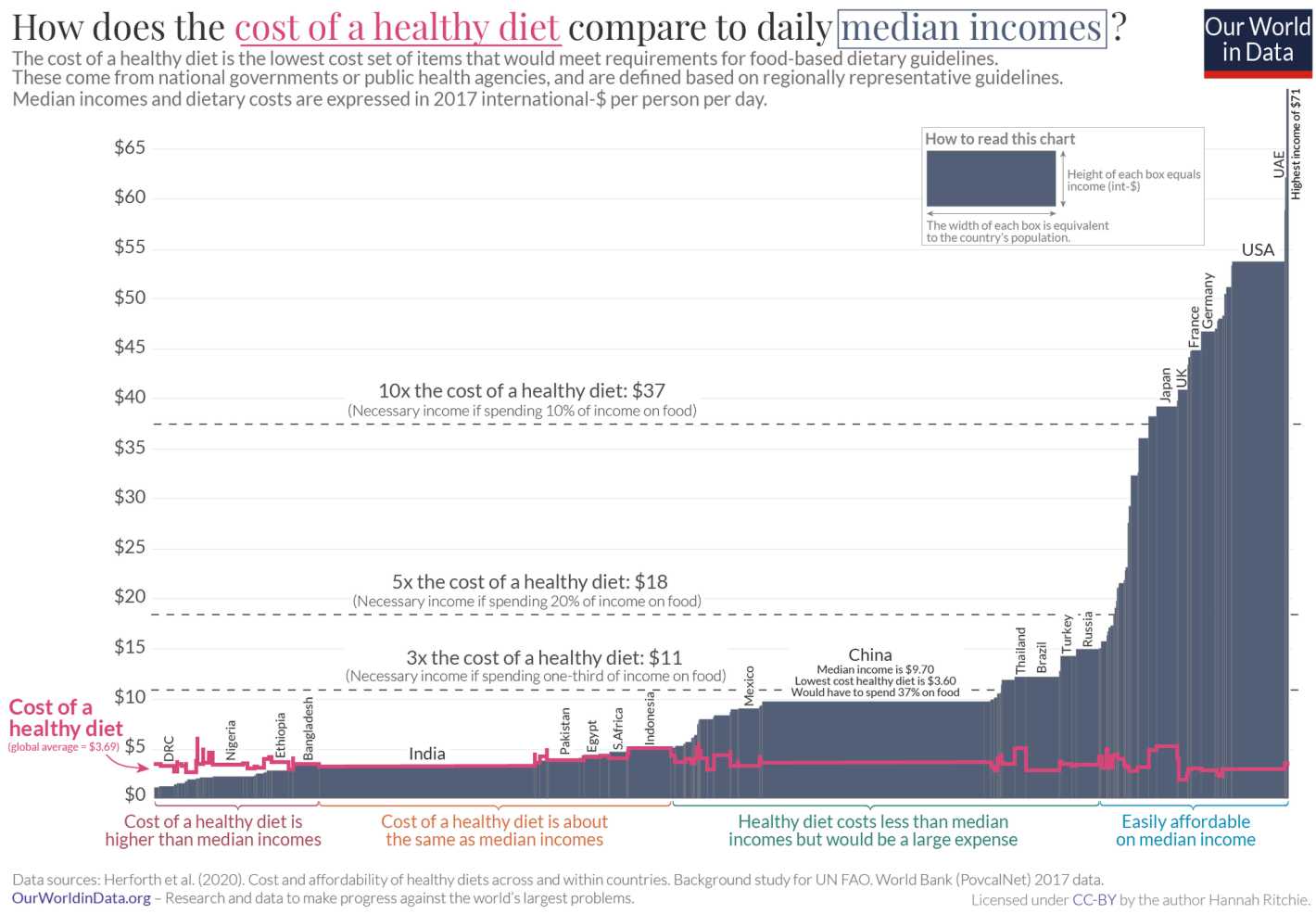 Lo que muestra esta comparación es lo lejos que está la mayor parte del mundo de poder pagar una dieta saludable. No podemos gastar todo, ni siquiera la mayor parte, de nuestros ingresos en alimentos. Tendríamos muy poco para gastar en otros elementos esenciales como energía, vivienda, ropa, educación y atención médica.