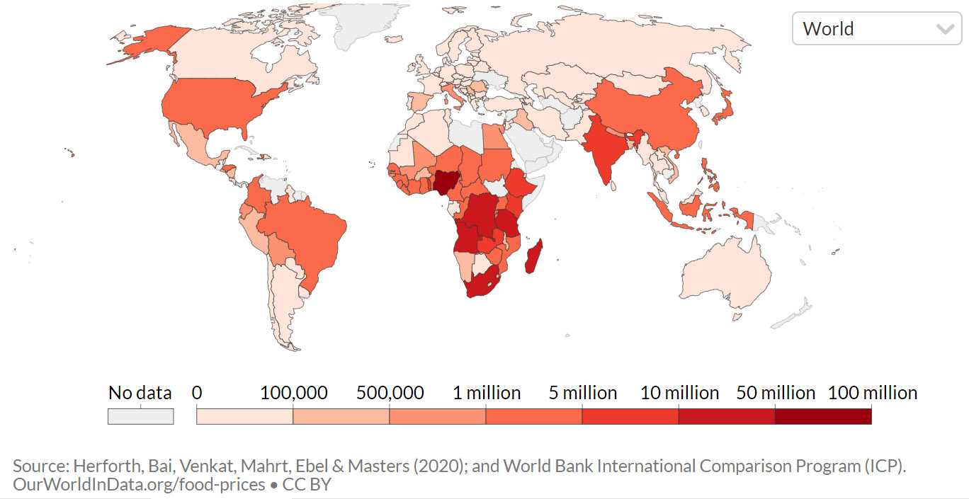 En algunos países (India es el más grande de ellos), los costos dietéticos serían aproximadamente iguales al ingreso medio. Allí, la gente tendría que gastar todos sus ingresos en alimentos para poder llevar una dieta saludable.