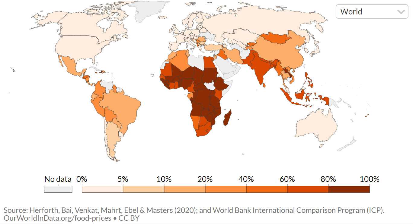 Cuando ponemos estos precios en el contexto de la asequibilidad, definiendo nuevamente esto como gastar el 63% de nuestros ingresos en alimentos, encontramos que 3.000 millones de personas no pueden permitirse una dieta saludable. En muchos de los países más pobres del mundo, particularmente en África subsahariana, es inasequible (o no se puede producir) para la mayoría de la población. Esto se muestra en el mapa que da estas cifras como porcentaje de la población total. En muchos países, una dieta saludable está fuera del alcance de más del 90%.