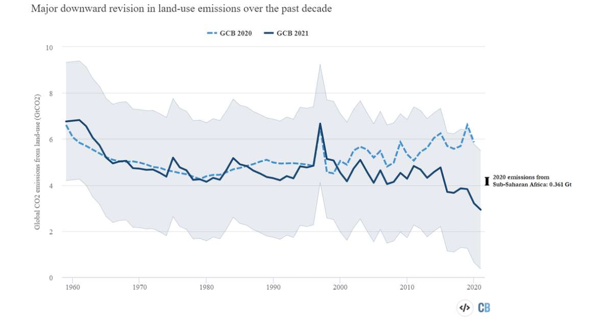 En 2020, los 1.100 millones de personas que viven en el África subsahariana emitieron solo 0,361 gigatoneladas (Gt CO2) de emisiones de CO2 fósil, una cantidad equivalente al 1% de las emisiones fósiles globales ese año. Por el contrario, los investigadores del Global Carbon Project (GCP) publicaron sus actualizaciones más recientes sobre las emisiones de CO2 en todo el mundo , con el notable nuevo hallazgo de que las emisiones globales de gases de efecto invernadero de los cambios en el uso de la tierra, como la deforestación y el desarrollo agrícola, probablemente se sobreestimaron entre 1 y 2 Gt CO2 durante gran parte de la última década (Fig. 1).La magnitud de esta moderada corrección a la baja en las emisiones anuales del uso de la tierra que acaba de publicar GCP eclipsa varias veces las emisiones de combustibles fósiles del África subsahariana. Mientras tanto, el rango de incertidumbre de un sigma de las emisiones globales del cambio del uso de la tierra abarca valores separados por 5 Gt de CO2, casi 14 veces más que la cantidad de emisiones del África subsahariana.