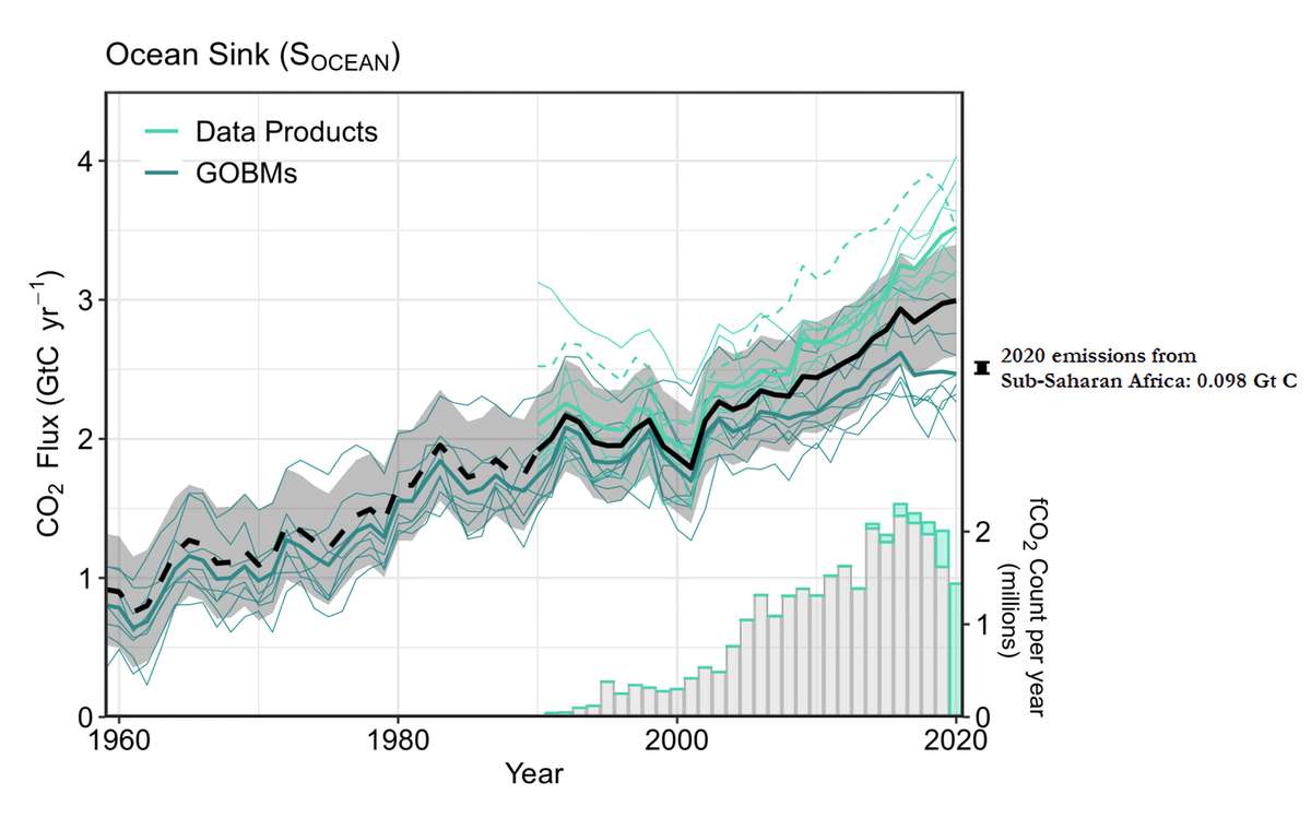 El mismo estudio de GCP informó nuevas estimaciones del sumidero de carbono del océano, o la cantidad de dióxido de carbono absorbido por el océano cada año (Fig. 2). Esta cantidad se calcula usando enfoques basados tanto en mediciones como en modelos, y las dos categorías de métodos producen valores que difieren en alrededor de 1 Gt C. Esta discrepancia es más de 10 veces mayor que las emisiones de CO2 fósil del África subsahariana (equivalente a ~0,098 Gt C en 2020).